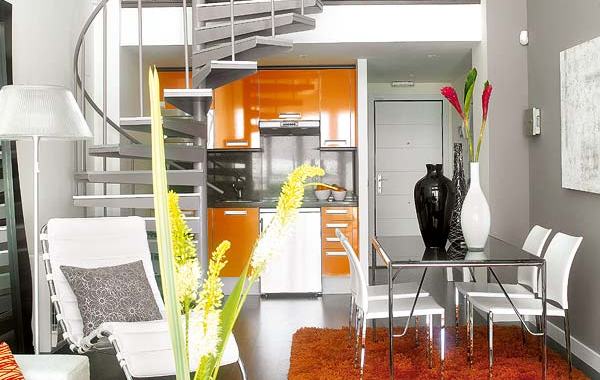 Chiếm 58 mét vuông, căn hộ này hiển thị các không gian chức năng được chia thành hai tầng. Tầng đầu tiên che chở các không gian sinh hoạt chính – nhà bếp, phòng ăn, phòng khách và phòng tắm, trong khi tầng hai bị chiếm bởi phòng ngủ. Cấu trúc kéo dài của căn hộ cho phép các không gian sống được thống nhất bởi một cầu thang xoắn ốc đầy phong cách.