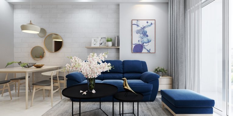 Ghế sofa màu xanh dương, bàn tròn màu đen được thiết kế nằm gọn trong thảm hình chữ nhật. Tranh treo tường màu sắc nhẹ nhàng giúp cho không gian phòng thêm phần trang nhã.