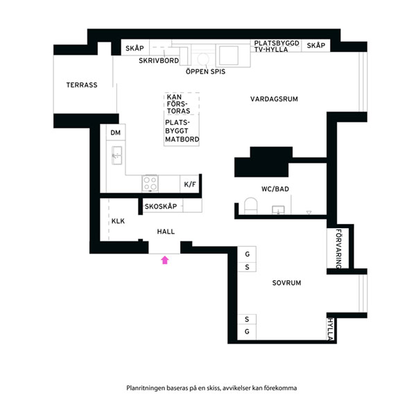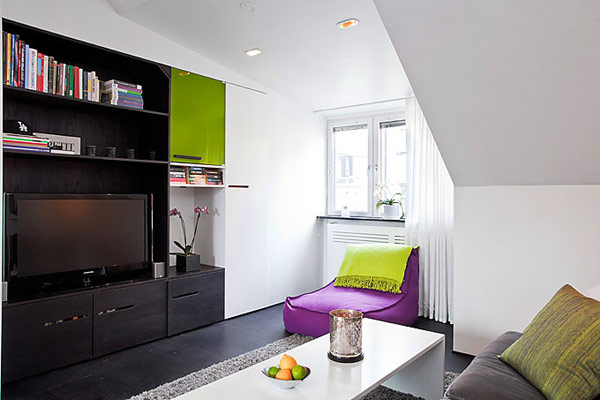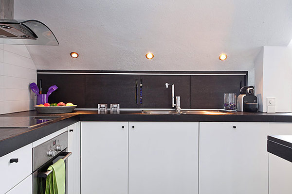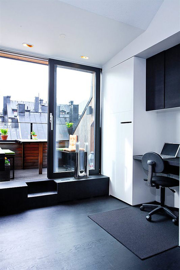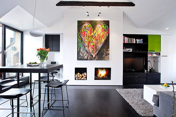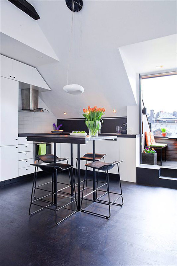 Nhìn vào những bức ảnh dưới đây và có vẻ khó tin là các nhà thiết kế đã làm được rất nhiều với diện tích chỉ 54 mét vuông. Khu vực sinh hoạt và ăn uống có kế hoạch mở dường như là cốt lõi của ngôi nhà; tràn ngập ánh sáng tự nhiên từ các cửa kính dẫn lên sân thượng và được trang trí một cách trang nhã, nội thất này không chỉ có chức năng, mà còn hấp dẫn trực quan. Các màu tương phản và bổ sung cho nhau trong một bố cục gây ngạc nhiên và truyền cảm hứng – đây là một nơi thể hiện sự tỉnh táo và vui tươi cùng một lúc.